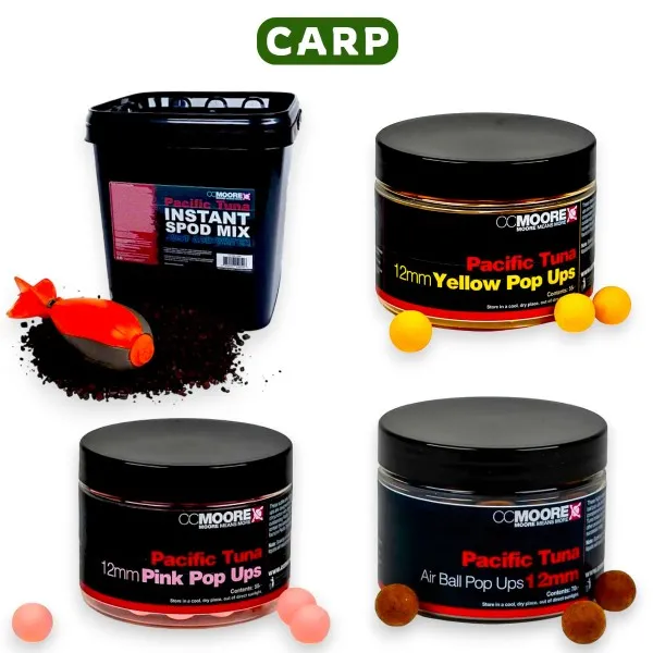 Специализираният сет CC Moore Pacific Tuna предлага пълен арсенал за успешен риболов на шаран. Съчетава мощния аромат на риба тон с разнообразие от цветови решения. 🎣
