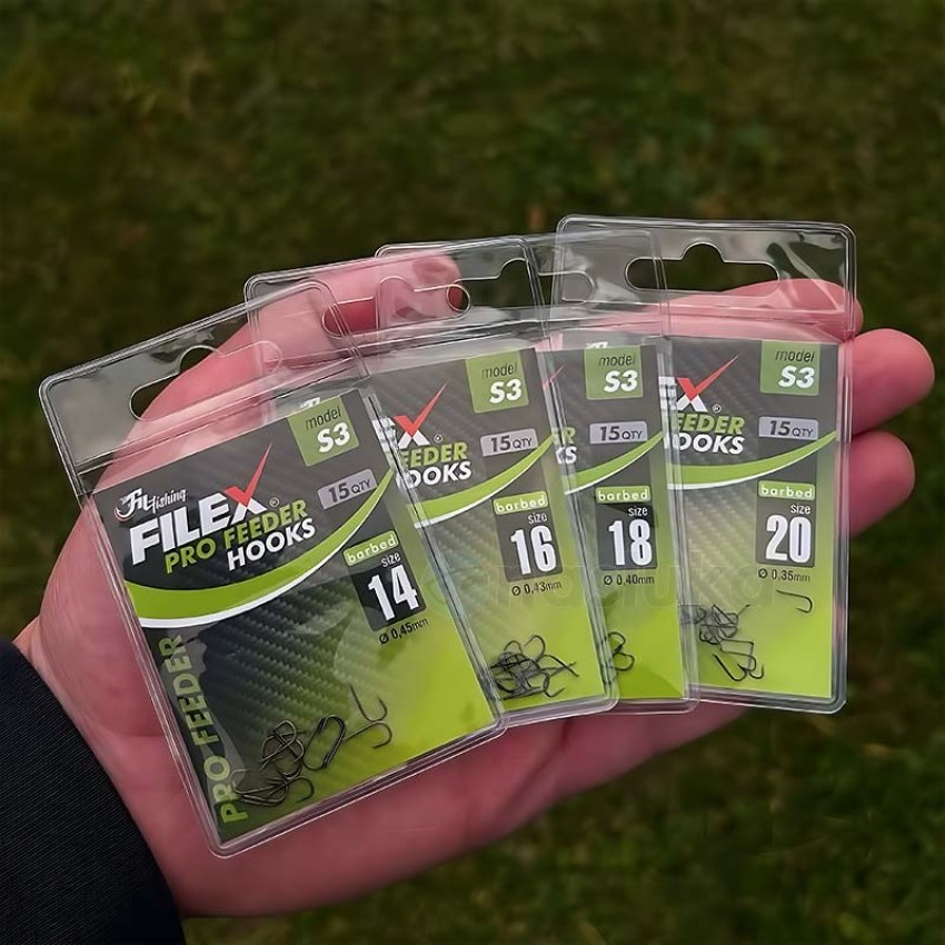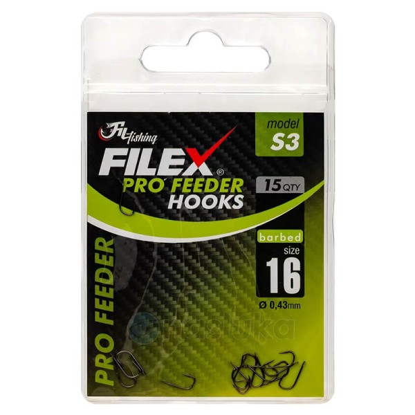 🎣 Filex Pro Feeder Hooks S3 са куки за фидер риболов с цвят черен никел. Изработени са с лазерно заточване и специална защита, която запазва върха остър дълго време.
