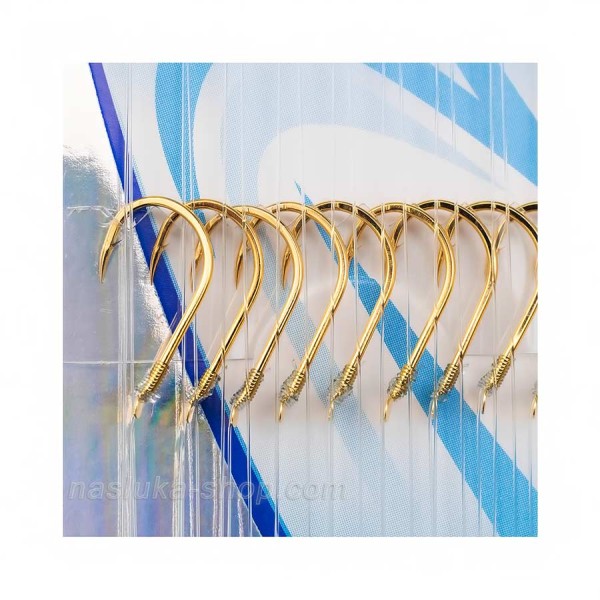 Куките са с жълт цвят - модел Chinu, ковани, здрави и изключително остри. За повод е използвано монофилно влакно Lazer с голяма износоустойчивост и здравина.