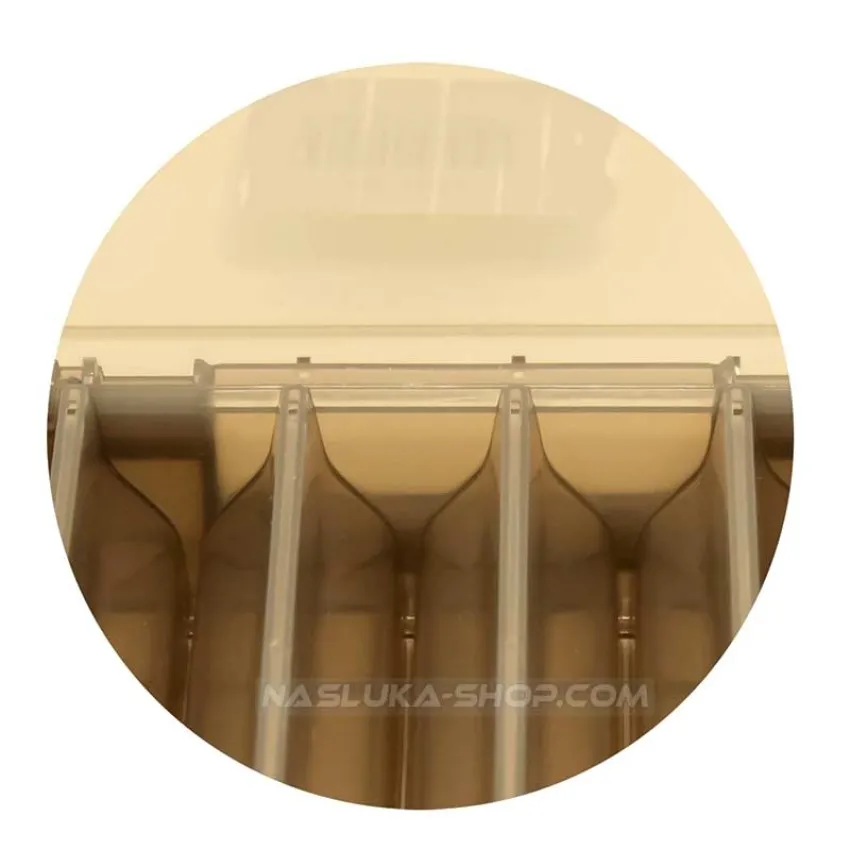 Моделът има по пет отделения с Y-образен профил от всяка страна, които осигуряват удобна подредба и защита на воблерите от счупване и надраскване.