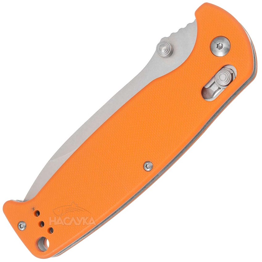 Комфортно и лесно се отваря с една ръка. Дръжката е с метална основа и чирени от G10 в оранжев цвят, като формата й приляга удобно в дланта.