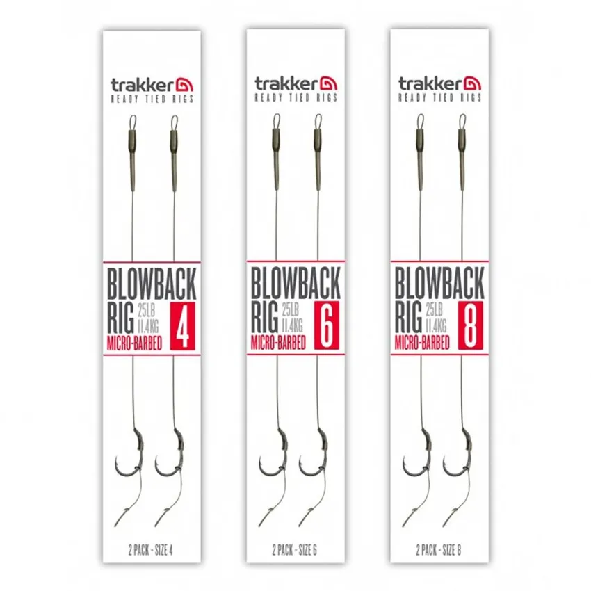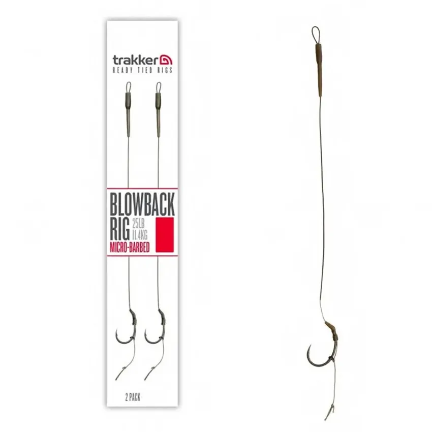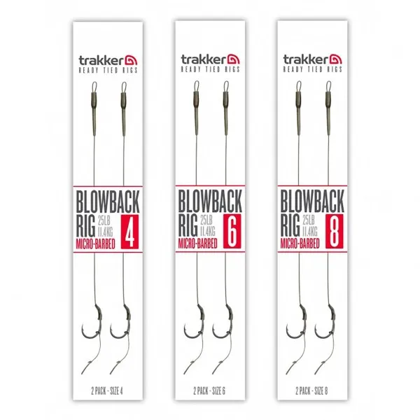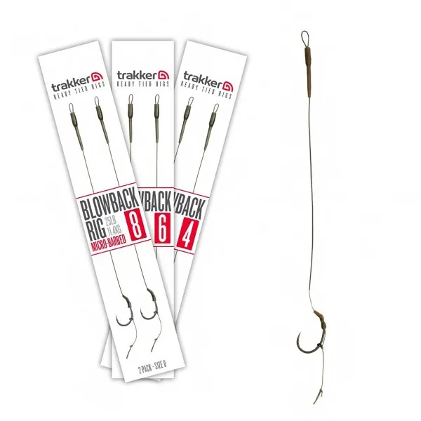 Монтажите за шаран Trakker Blowback Rig са проектирани за максимална ефективност при закачане. Всеки монтаж е изработен с острата кука Clinga BP и малък rig ring, позициониран на стеблото.