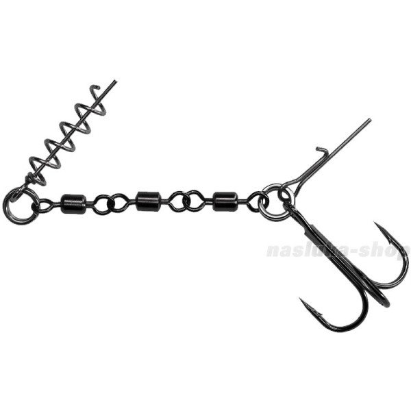 Благодарение на спираловидния винт примамката се монтира бързо и лесно, а острата и здрава тройна кука се фиксира с помощта на предвидения за целта метален пин.