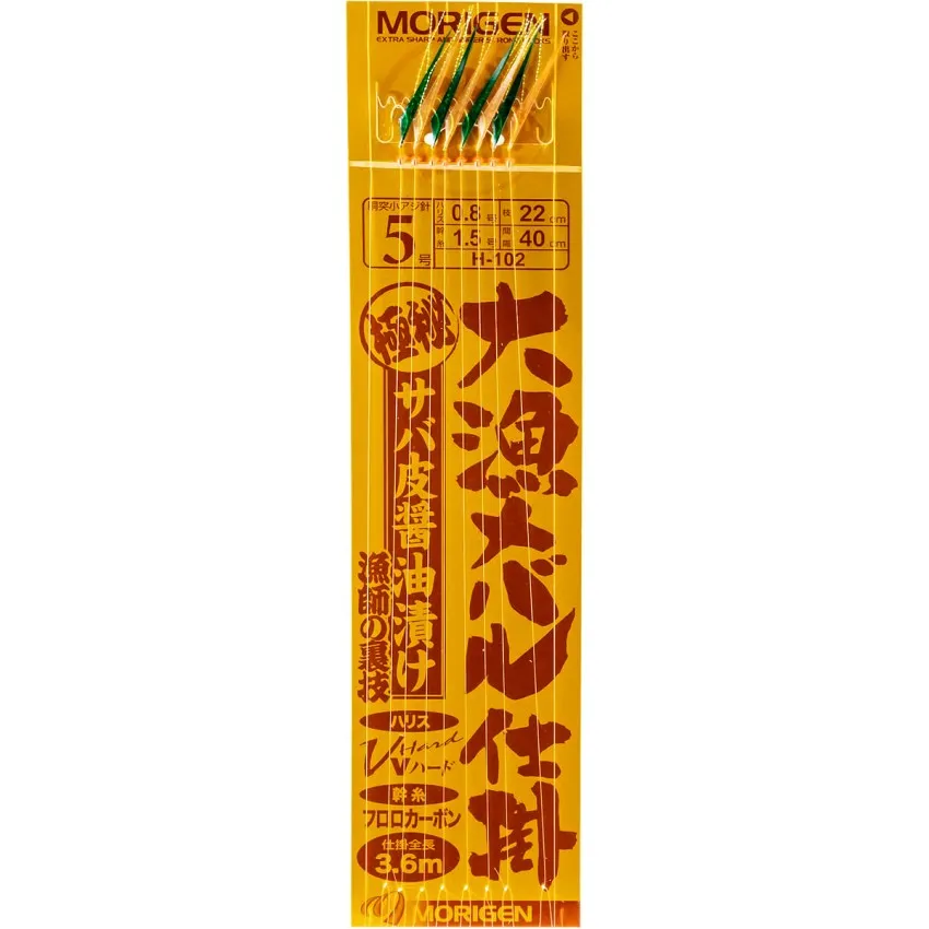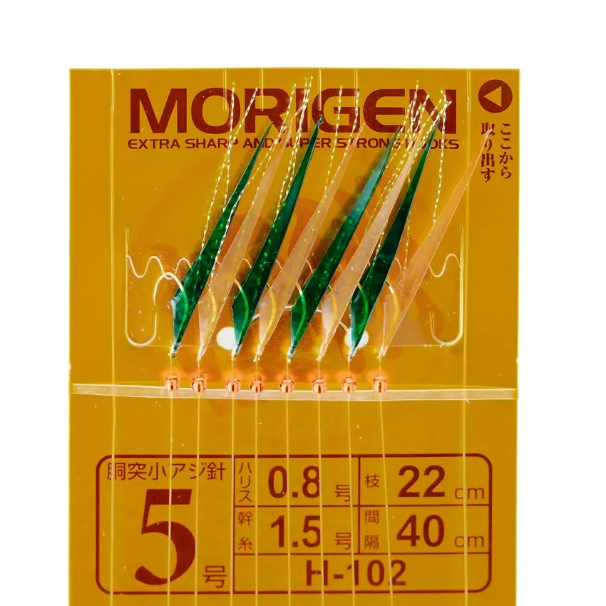 Morigen Sabiki H-102 е висококачествено морско чепаре, изработено изцяло от японски материали. Основната линия и поводите са от 100% флуорокарбон, което осигурява невидимост във водата.