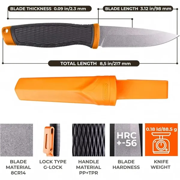 Ножът Ganzo G806-OR е надежден спътник за всеки любител на къмпинга и риболова. Изработен с фиксирано острие от 98 мм и дебелина 2,3 мм, този модел осигурява стабилност и издръжливост при интензивна употреба 🔥