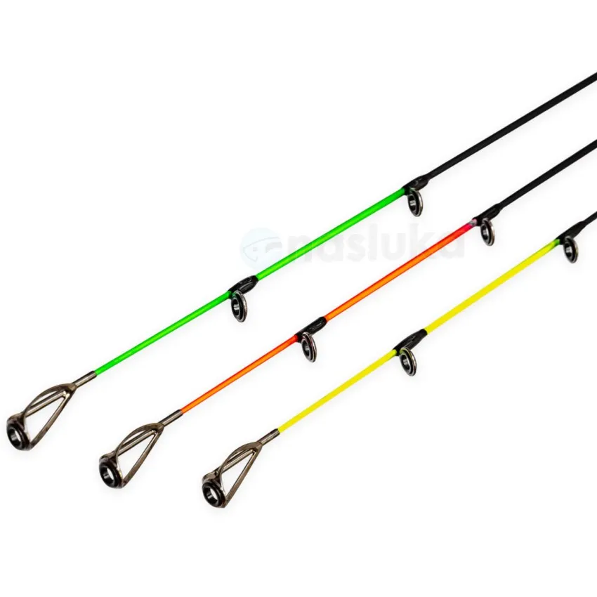 Всяка въдица е окомплектована с три карбонови върха с различна акция - S, M, H.