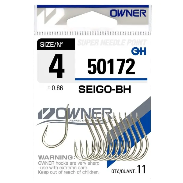 Owner Seigo-BH e кука произведена по специална технология. Много здрави с допълнителна контра на стеблото за добро задържане на стръвта. Куките са ковани за по-голяма здравина и са леко усукани странично. Идеални са за риболов на дъно за големи риби.