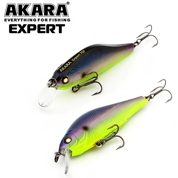 Akara Expert 70F е плаващ воблер за щука и костур с дължина 70 мм, тегло 9 g и работна дълбочина 0-1.5 m. Моделът е от клас Shad с изразителна игра - стабилни вибрации и реалистични странични движения, които имитират ранена рибка 🎣