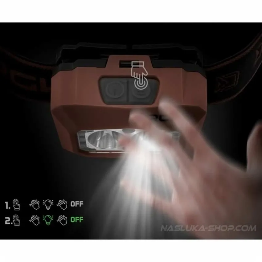 Сензорът за движение може да се активира с втория бутон, разположен отгоре на корпуса. С едно махване на дланта челникът се включва и изключва.
