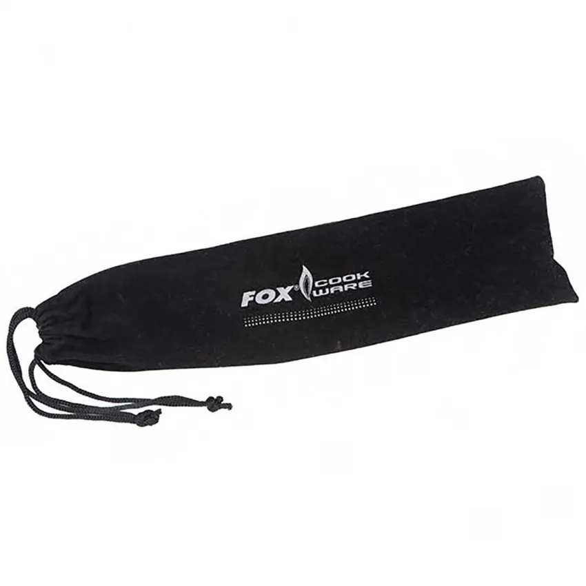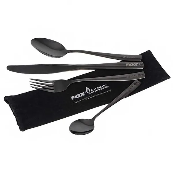 Комплектът Fox Black Stainless Cutlery Set включва лъжица, чаeна лъжичка, вилица и нож от неръждаема стомана с матово черно покритие. 🎣 Всеки елемент носи дискретния логотип на Fox.