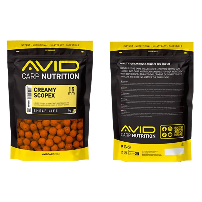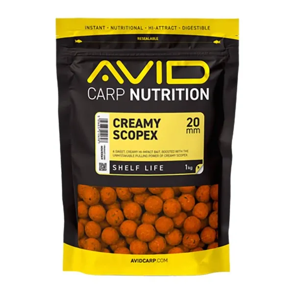 Протеиновите топчета Avid Carp Creamy Scopex съчетават класическия Scopex аромат с висококачествени съставки за богат, сладък и кремообразен профил. 🎣