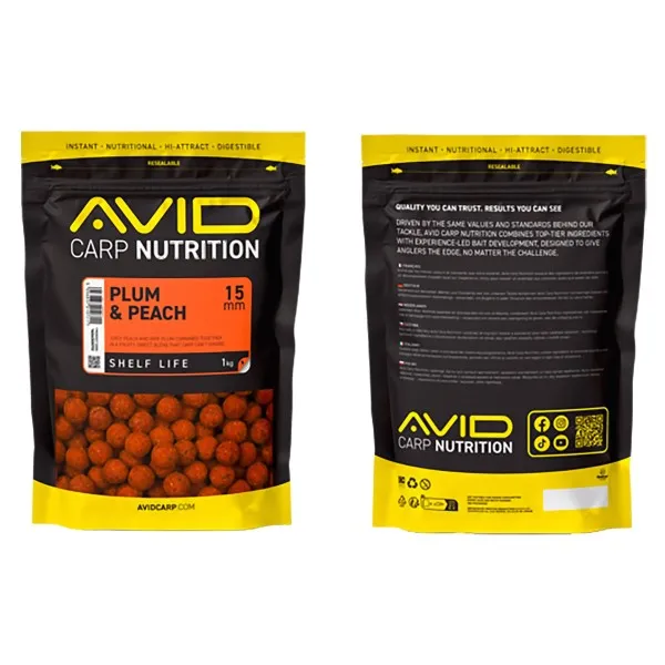 Протеиновите топчета Avid Carp Shelf Life Boilies Plum & Peach съчетават сочния вкус на праскова с богатия аромат на зряла слива. Тази комбинация създава изключително привлекателна стръв, на която шараните не могат да устоят.