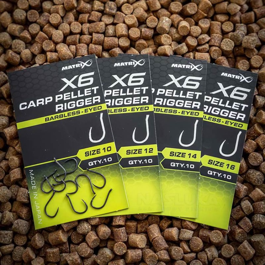 Куките Matrix X6 Carp Pellet Rigger са създадени с една-единствена цел – максимална ефективност при риболов на шаран с пелети или мека стръв, особено в условията на състезателен и интензивен комерсиален риболов. Това са куки с ухо и без контра, които съчетават здравина, прецизност, бързо проникване и сигурно задържане, дори при най-фините монтажи.