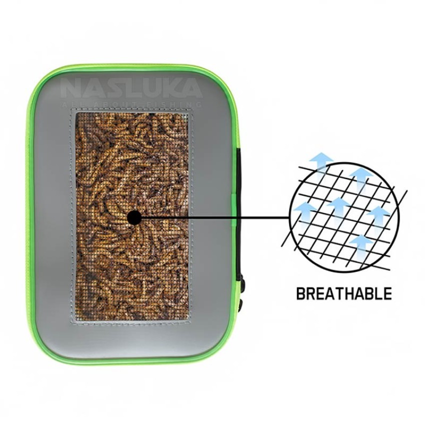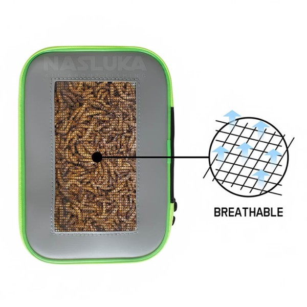 Капакът разполага с черна мрежа, за да осигурява достатъчно въздух, което предпазва живата стръв от прегряване и я запазва свежа за по-дълго време.