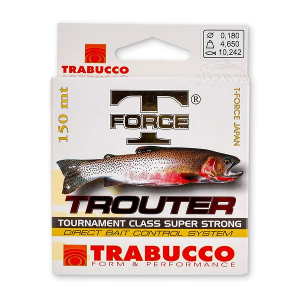 Trabucco T-Force Trouter е качествено монофилно влакно от състезателен клас, подходящо за риболов на пъстърва в реки и комерсиални водоеми. Напълно непромокаемо със специален силиконов слой, който изолира вътрешната структура от външни агенти, запазвайки характеристиките на влакното за дълго време, а също и при много ниски температури. Триенето се намалява до минимум, което позволява дълги и точни замятания и намалява изтъркването от водачите. Прозрачният цвят поддържа ниска степен на видимост в прозрачни води.
