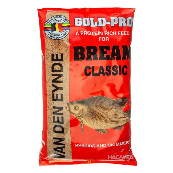 Gold Pro Bream е еднa от най-ароматните захранки за риболов от серията Van den Eynde със сладък карамелен аромат, който напомня на добавката Brasem. Специално разработена за риболов на платика, тази легендарна захранка вече 30 години печели световни и европейски първенства и е задължителна за много състезатели и любители риболовци. Gold Pro Bream е силно подсладена, ароматна и пухкава, като може да се използва в реки, канали и стоящи води. Доказано привлича от голямо разстояние платика и морунаж, като ги задържа на захраненото място дълго време. Освен за оформяне на топки при риболов на плувка, захранката е много подходяща и за фидер риболов, като образува пухкава смес, която се придържа към фидер хранилката и избухва на дъното. Може да се ползва като самостоятелна смес или в комбинация с други захранки. Препоръчително е към нея да се прибави от стръвта с която ще се лови.