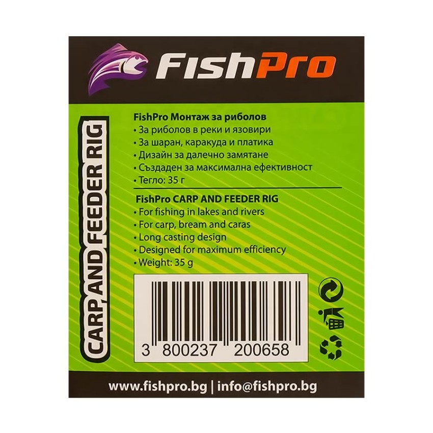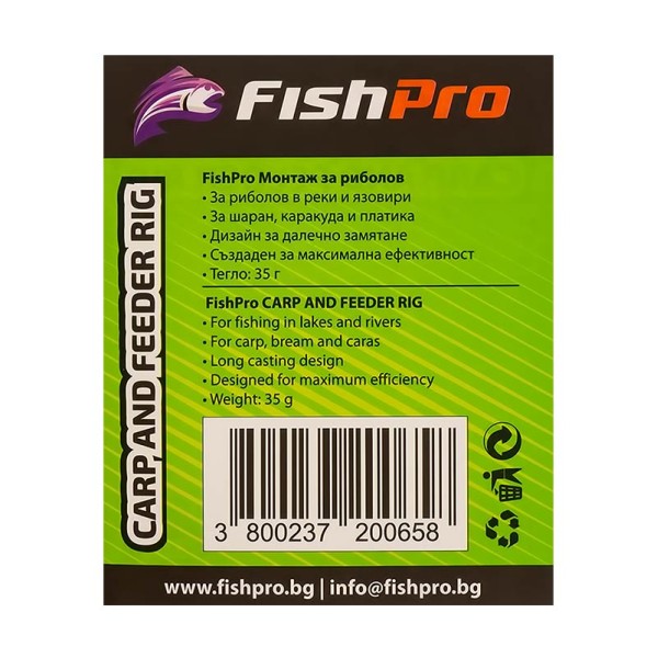 FishPro Carp And Feeder Rig е специална система за дънен риболов на мирни риби като шаран, каракуда, лин, платика и др.