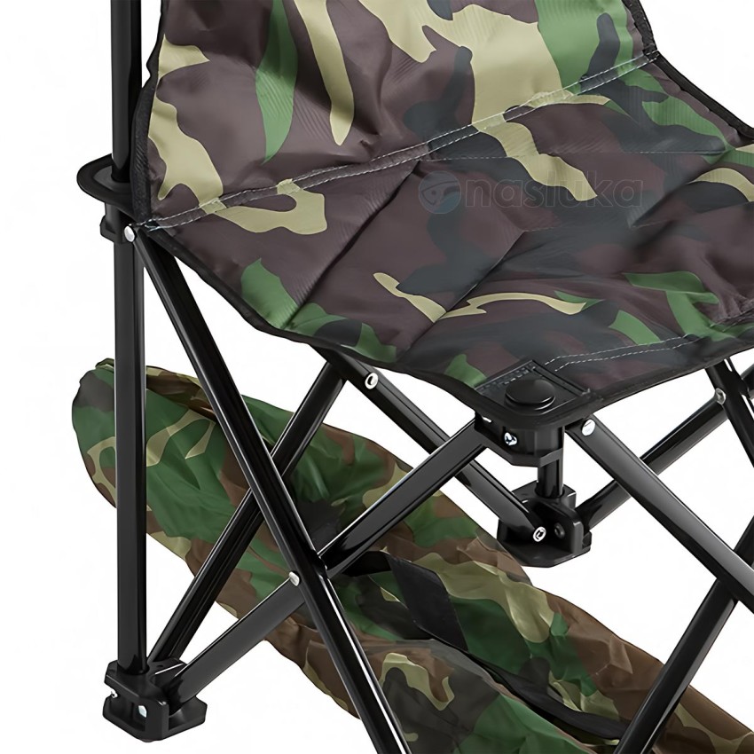 Изработен е от издръжлива стоманена рамка и здрав текстилен плат с камуфлажен десен, устойчив на износване и влага. Материята осигурява комфорт дори при продължително седене, а формата на седалката и облегалката гарантира естествена опора на гърба.
