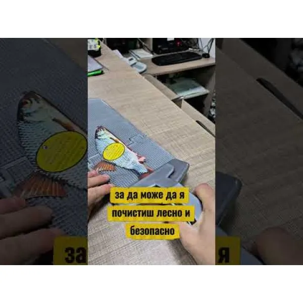 - Здравата скоба стабилно задържа рибата при чистене.