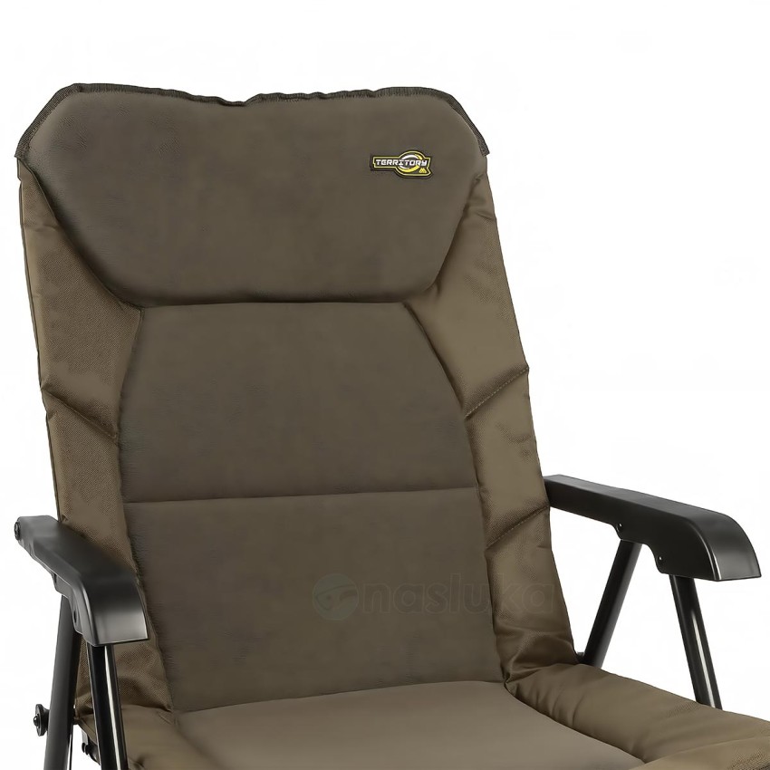 Високата, подплатена облегалка и широката седалка осигуряват невероятен комфорт и опора на гърба и кръста. Металната рамка е супер здрава и устойчива на всякакви терени, докато неплъзгащите крака гарантират стабилност дори на влажна или мека почва.🪑