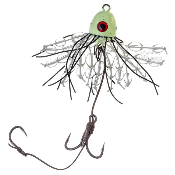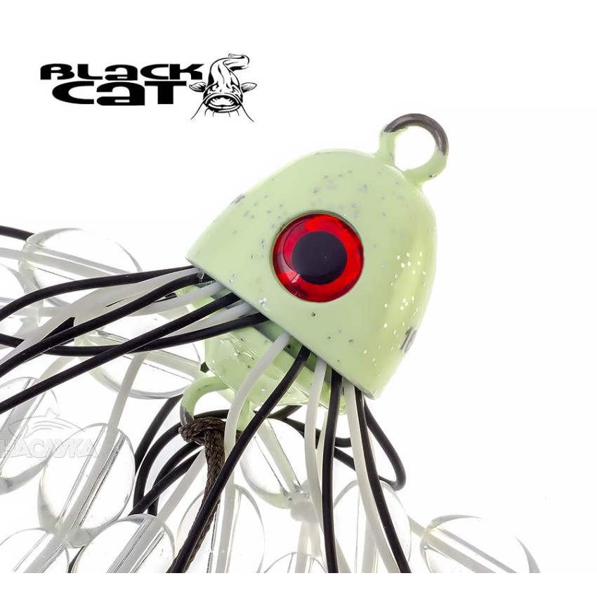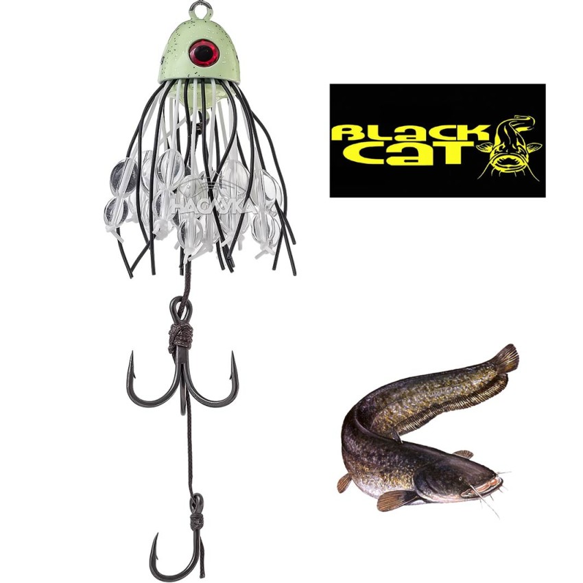 Високоефективна примамка Тийзър за риболов на сом от лодка - Black Cat Battle Teaser. Примамката е с флуоресцентна оловна глава, която свети под водата и излъчва вибрации под водата, които привличат големите риби от разстояние. Гумените пипала пулсират много съблазнително във водата, а стъклените топчета издават силни, тракащи звуци, което значително увеличава агресивността на сома.