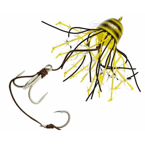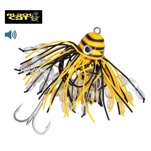 Изкуствена примамка за риболов на сом от лодка, предимно на кльонк. Примамката въздейства едновременно с тракащия звук, който издава благодарение на стъклените перли, и с ярките, флуоресцентни цветове на силиконовите ленти и оловната глава. Към оловната глава са добавени силиконови ленти в черен и жълт цвят. Black Cat Battle Teaser е окомплектована с безкомпромисно здрави и отлично заточени дуратинови куки - основна тройна кука размер 6/0 и допълнителна единична, размер 3/0. Куките са вързани със специално плетено влакно с издръжливост до 100 кг.