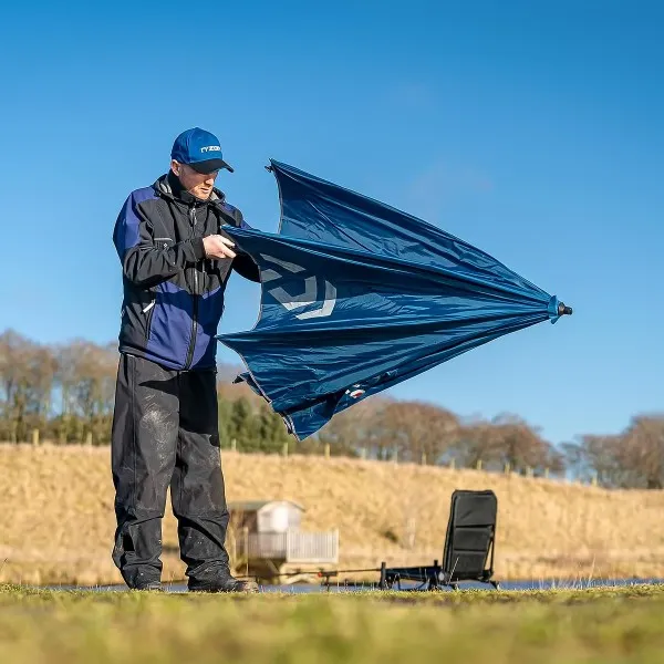 Риболовен чадър Daiwa N'Zone с диаметър 250 см осигурява надеждна защита при всякакви метеорологични условия. Водоустойчивата материя с подсилени шевове издържа на продължителни валежи. 🌊