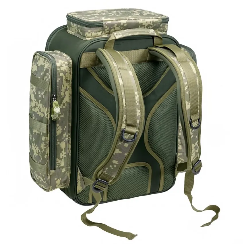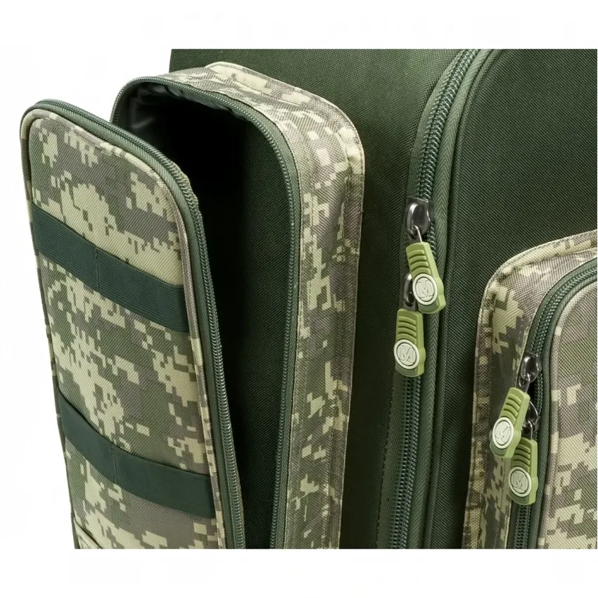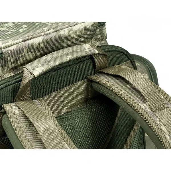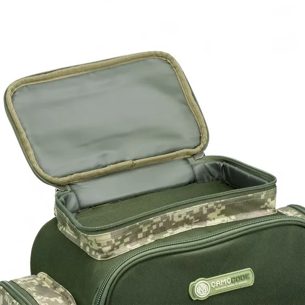 Риболовна раница Mivardi CamoCode Cube е многофункционален модел със среден размер, предназначен за транспортиране на риболовни аксесоари. 🎣 Осигурява бърз и лесен достъп до съдържанието благодарение на отварящата се предна стена и големи външни джобове.