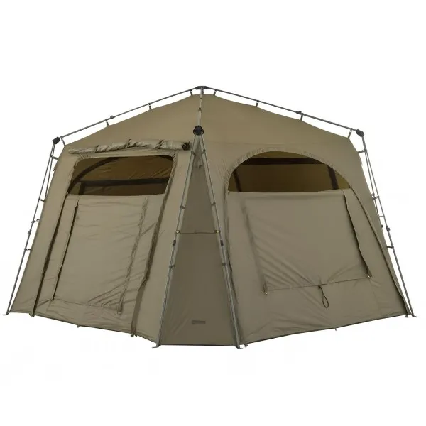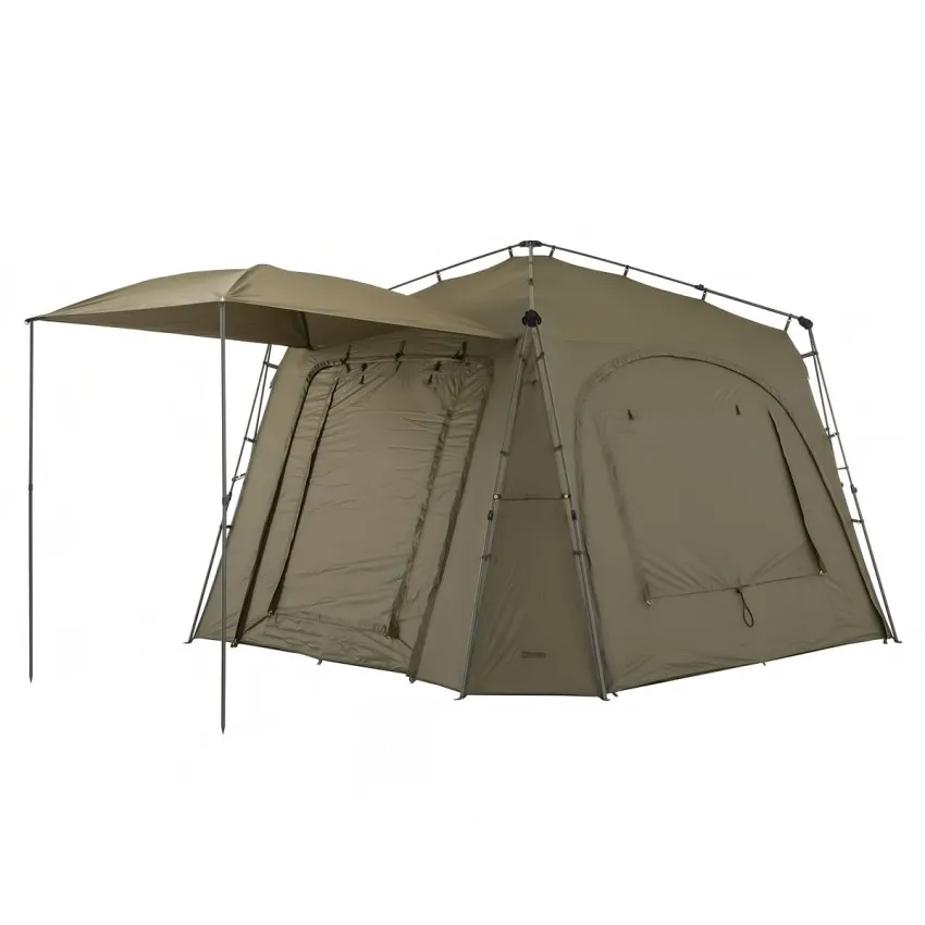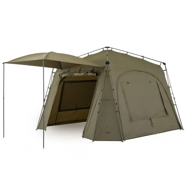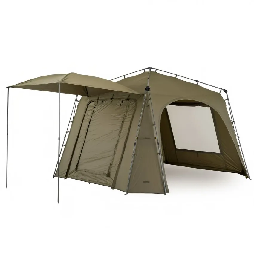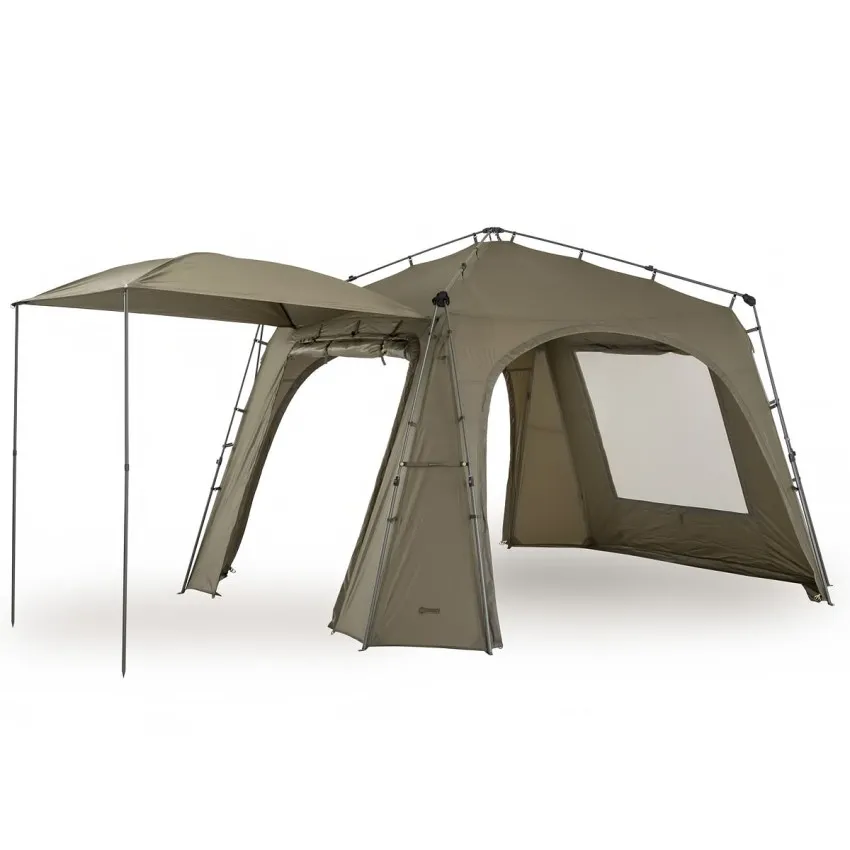 Шатрата Base Camp XL предлага отлична защита при шарански риболов и дълги сесии. Навесът се сгъва напълно без демонтаж, а страничните панели могат да се отстранят за свързване с палатка чрез допълнителен комплект.