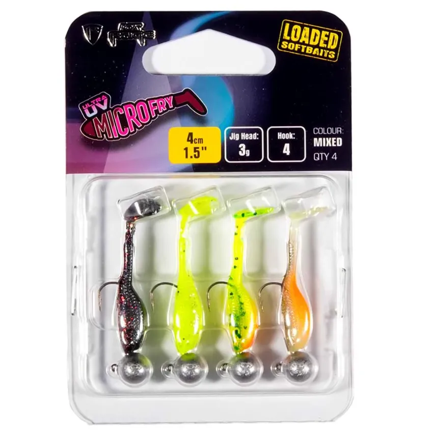 Fox Rage MicroFry UV е сет от 4 броя силиконови шадове с монтирани джиг глави, специално създадени за ловене на активни хищници. 🎣 С размер 40мм и тегло , примамките са идеални за лек спининг риболов.