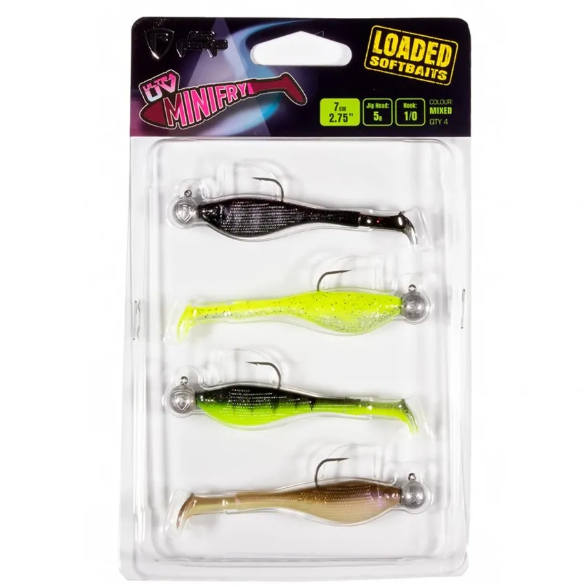 Fox Rage UV Mini Fry Loaded Mix Pack е комплект от готови силиконови монтажи в ярки UV цветове, идеални за активен риболов на хищници. 🎣 Всяка примамка е предварително монтирана с качествена джиг глава, което спестява време и гарантира перфектен баланс.