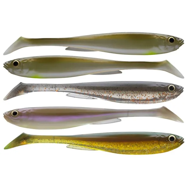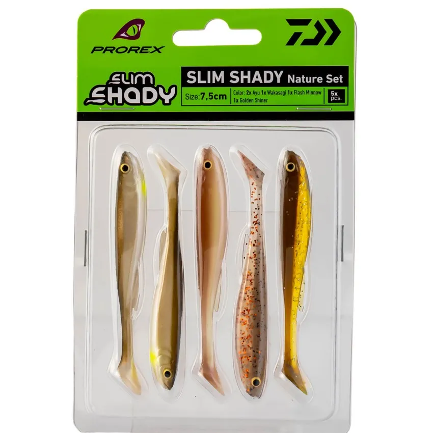 Комплектът Daiwa Prorex Slim Shady Nature Set включва 5 броя силиконови примамки с дължина 7.5 см в естествени цветове. Стройната форма имитира основната плячка на хищниците - уклея.