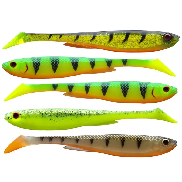Тънкият профил осигурява лесно замятане и естествени движения. Цветовете в сета: Ghost Firetiger, Real Firetiger (2 бр.), Chartreuse Shocker и Natural UV Perch 🎣