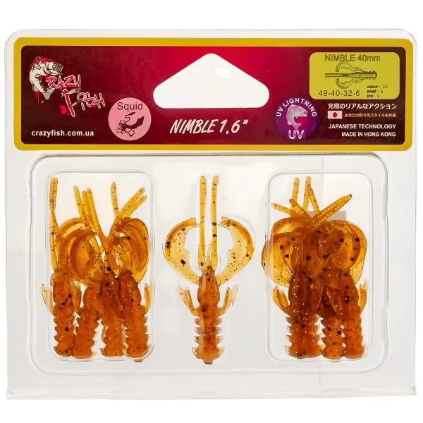 Crazy Fish Nimble 2.5'' е силиконов рак с активни щипки, които започват да трептят веднага след попадане във водата. 🎣 Движението е естествено и провокира атаката на костур, щука и бяла риба.