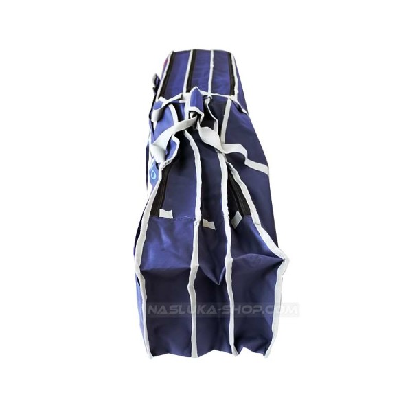 Снабден с дълъг външен джоб за колчета или кеп, централен ремък за рамо и дръжки за носене в ръка.