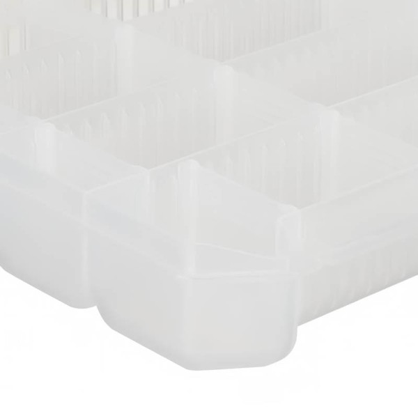 Кутията разполага с 4 фиксирани отделения и 16 броя допълнителни подвижни прегради (включени в комплекта). Това позволява гъвкава конфигурация според размера и формата на съхраняваните примамки или аксесоари - особено полезно при джигове, пилкери, воблери, куки, блесни, глави и други елементи с различни габарити.