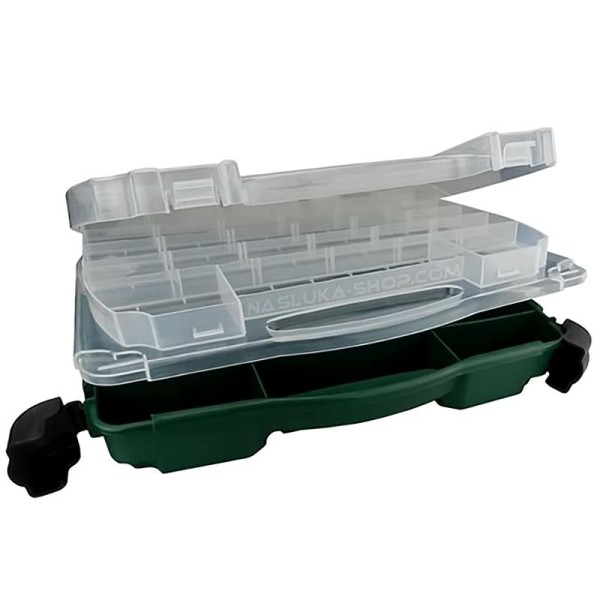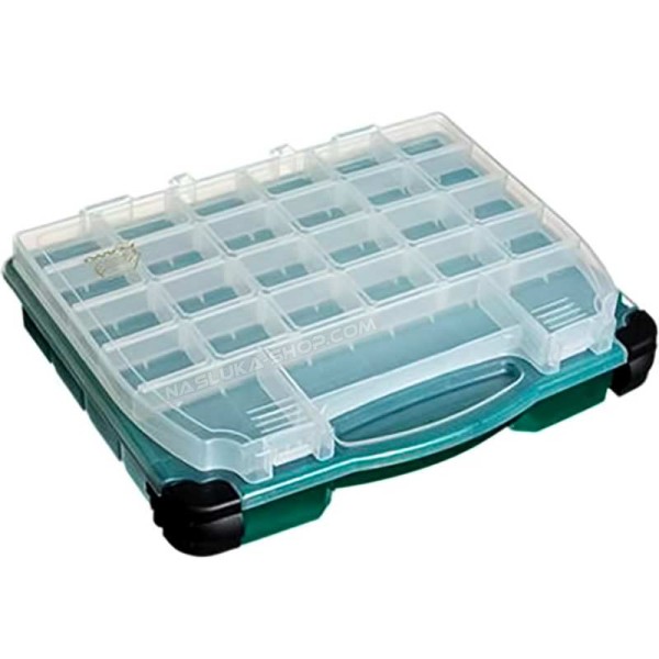 Кутията е от здрава здрава пластмаса с прозрачен капак. Снабдена с твърда дръжка за удобно носене. Солидните закопчалки и панти гарантират продължителна безпроблемна употреба.