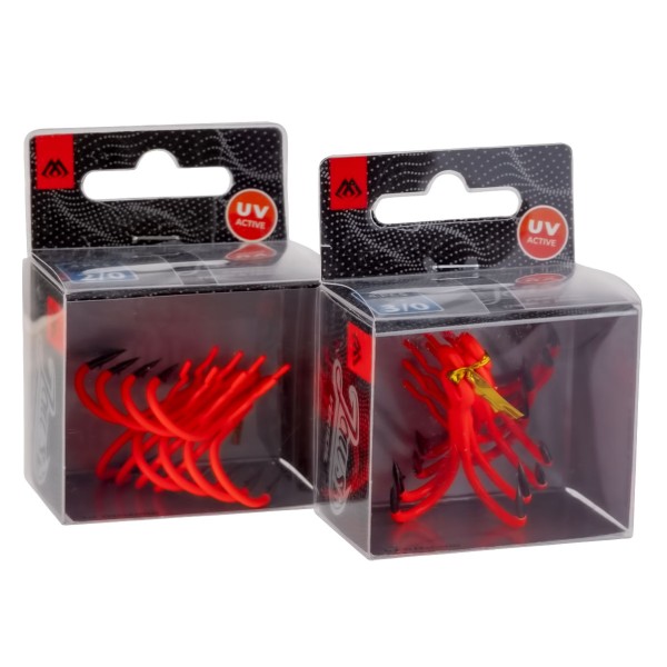 Всяка опаковка съдържа 4 броя тройни куки Mikado Jaws Vertical UV Orange.