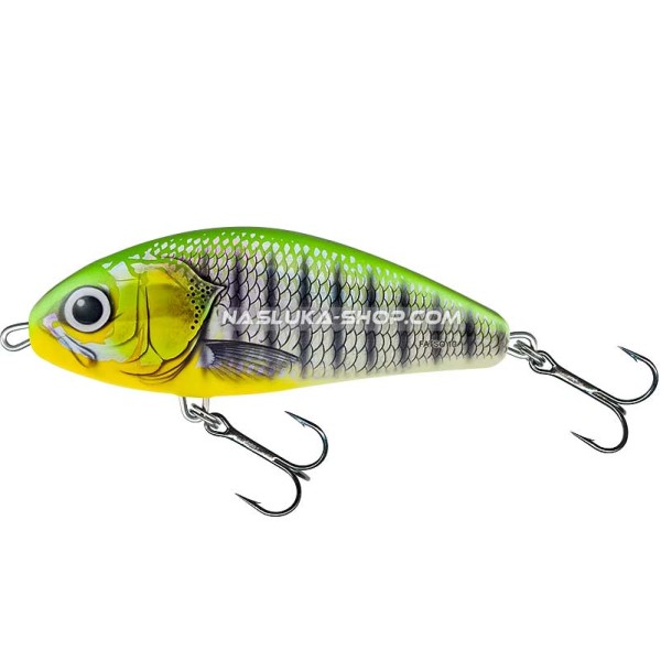 Примамка за улов на трофейни екземпляри щука и сом. Salmo Fatso е воблер, който притежава типичната игра на кранкбайт, независимо, че е lipless модел (без лопатка).