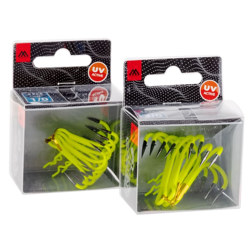 Тройните куки с клипс Mikado Jaws Vertical UV Fluo осигуряват надеждност при работа с големи силиконови примамки. Изработени от високоякостна стомана с невероятно остри върхове, тези куки са с ярко UV жълто покритие, което увеличава видимостта при мътна вода или слаба светлина. 🐟
