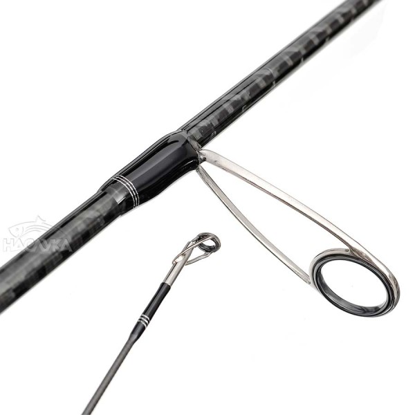 Въдицата е оборудвана с невероятно леки титаниеви SeaGuide водачи с RS-ring. Веднага прави впечатление макародържачът Fuji DPS+Carbon, който осигурява директен контакт с бланката, без междинни уплътнения, които да погасяват трептенията на примамката, предавани по въдицата.