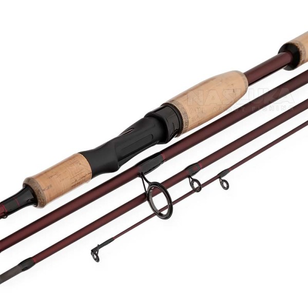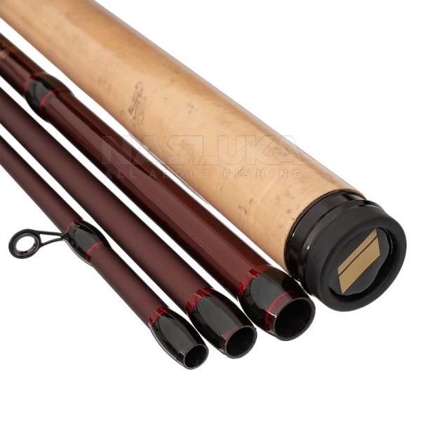 Създадена с внимание към детайлите, въдицата е разделена на 4 секции, което я прави изключително удобна за носене, без да прави компромиси с действието и чувствителността на бланката. Елегантният тъмночервен цвят на бланката и корковите дръжки допълват модерния дизайн, осигурявайки същевременно стабилен захват и комфорт по време на риболов.