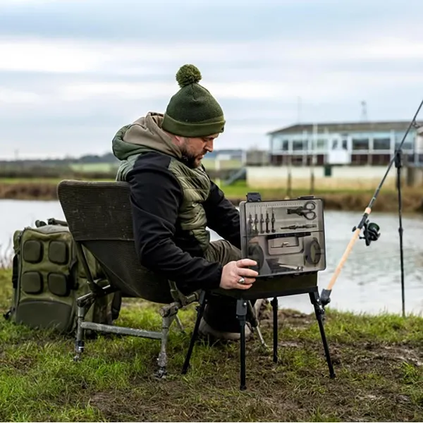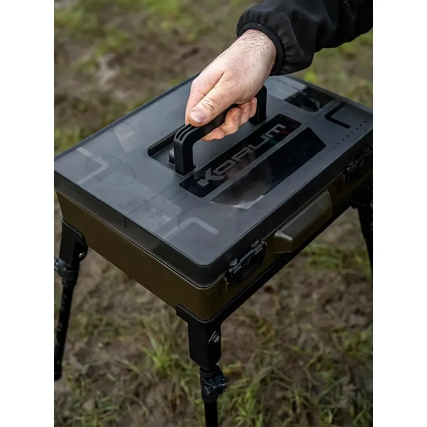 Компактна и практична станция за фидер такъми от Korum Mega Blox Station, Fully Loaded - Перфектният помощник за всеки риболовец! Тази здрава и функционална станция за аксесоари и монтажи събира на едно място всичко необходимо за фидер и метод фидер – от куки и влакна до инструменти и готови поводи.