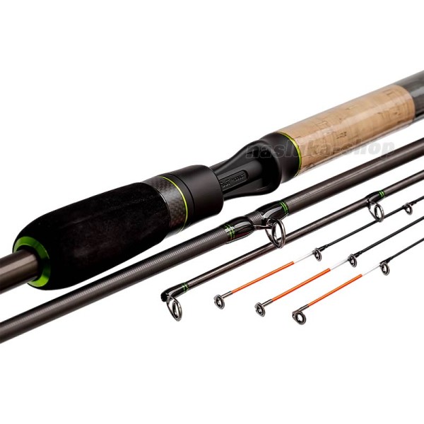 - Върхове: Включва три карбонови върха с различна акция, които ви дават възможност да се адаптирате към условията на риболов - от спокойни води до силно течение.