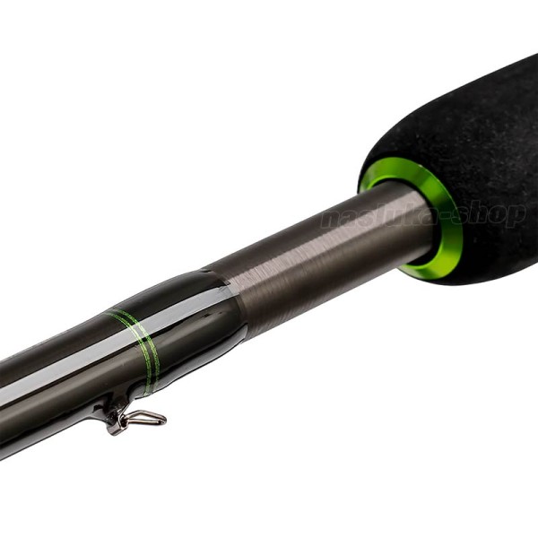 - Материал: Изработена от високомодулен карбон, осигуряващ здравина и ниско тегло. Гъвкавостта на бланката позволява отлично действие при борба с едри риби.