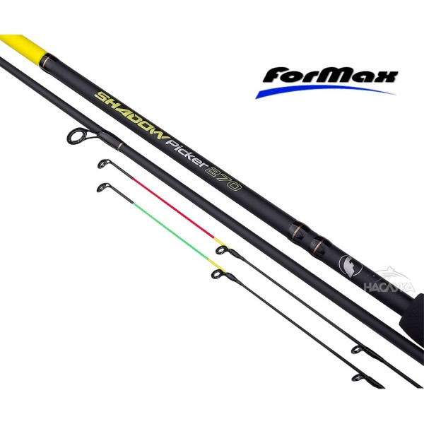 Formax Shadow Picker е висококачествен и чувствителен пикер, идеален за риболов в по-малки водоеми или на къси разстояния, когато се изисква прецизност с леки и малки фидер хранилки и тънки влакна. Състои се от два броя тънки, леки и много чувствителни карбонови бланки, оборудвани със SIC водачи и елегантен вграден макародържач. Предлага се с два взаимозаменяеми карбонови фидер върхове с акции: 1oz и 2oz. Риболовът с Shadow Picker е истинско удоволствие, особено когато се налага да се ловят деликатни риби на къса дистанция. Подходящ за реки и езера.