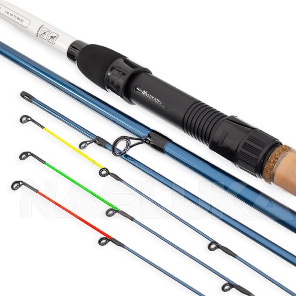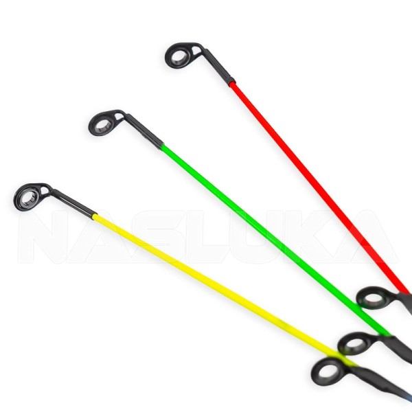 Фидер въдицата е в комплект с 3 върха (2 стъклопластови + един карбонов), чиято сензитивност позволява да регистрират успешно всяко кълване.