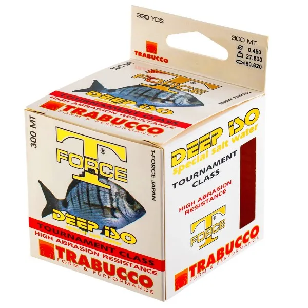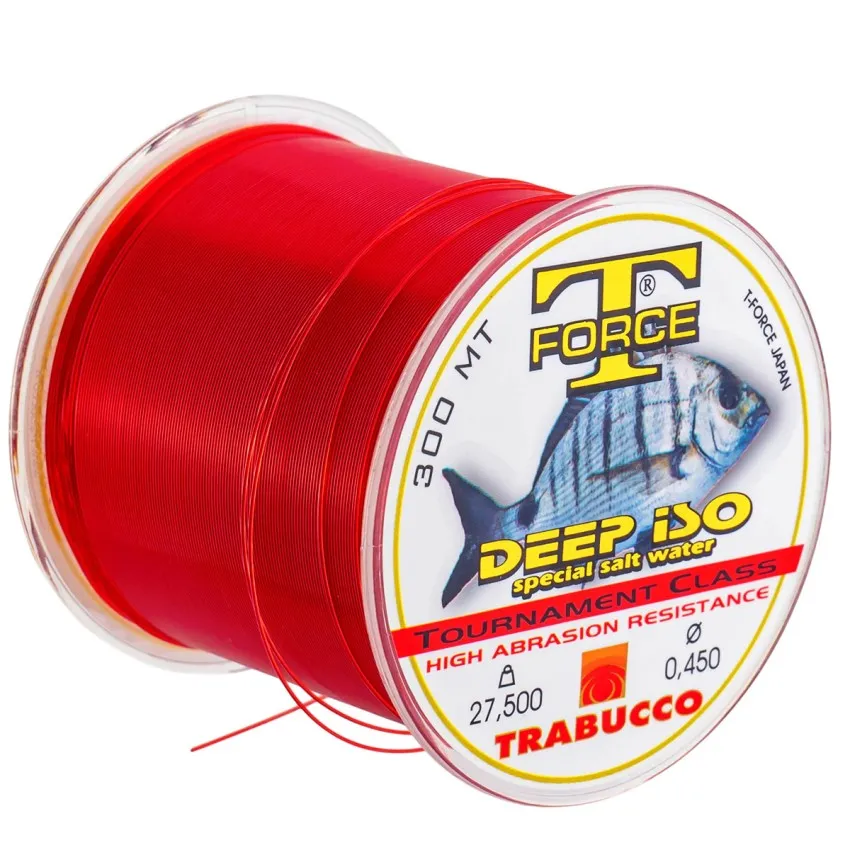 Trabucco T-Force Deep Iso е специализирано монофилно влакно за морски риболов, създадено да издържа на агресивната солена среда. 🎣 Характерният червен цвят улеснява контрола при дълги дистанции.