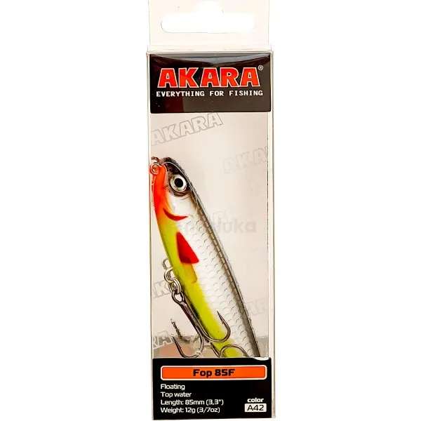 Воблер Akara Fop 85F 85 мм, 12 г - цвят A42 е плаващ повърхностен воблер, предназначен за щука и распер в плитки участъци и над водна растителност.