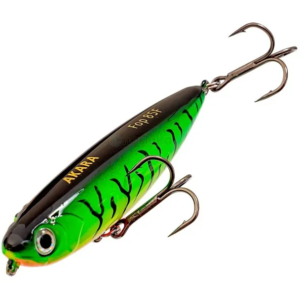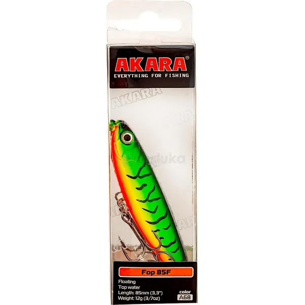 Воблер Akara Fop 85F 85 мм, 12 г - цвят A68 е повърхностна примамка с агресивно действие, създадена за активен спининг риболов на щука, костур и распер.
